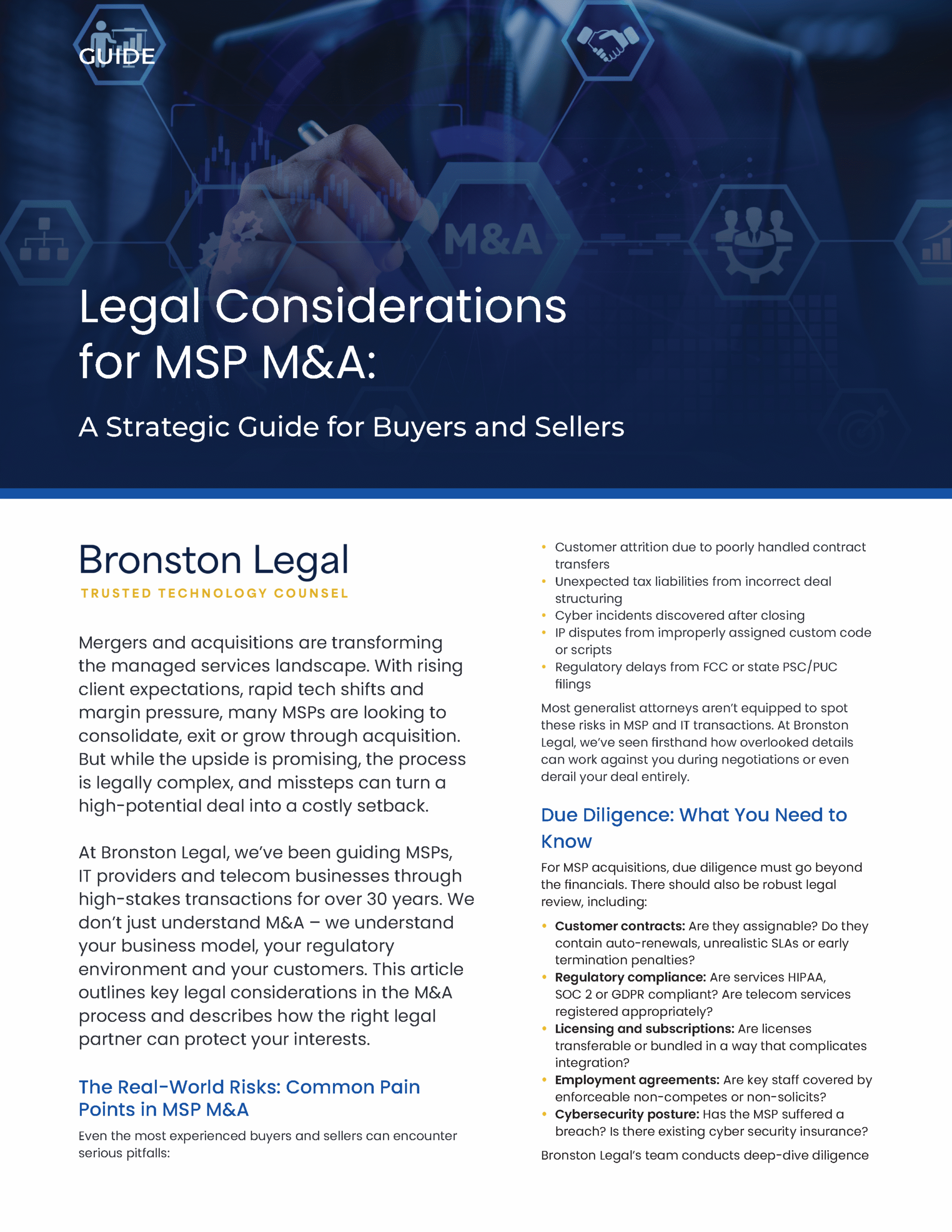 This strategic guide outlines the key legal risks and considerations involved in managed service provider (MSP) mergers and acquisitions. Learn how to navigate due diligence, regulatory compliance, intellectual property ownership, contract transfers, cybersecurity risks, and deal structuring to protect enterprise value and avoid costly pitfalls. Designed for MSP owners, buyers, and investors, this guide provides practical insights to help ensure a smoother transaction and successful post-close integration.